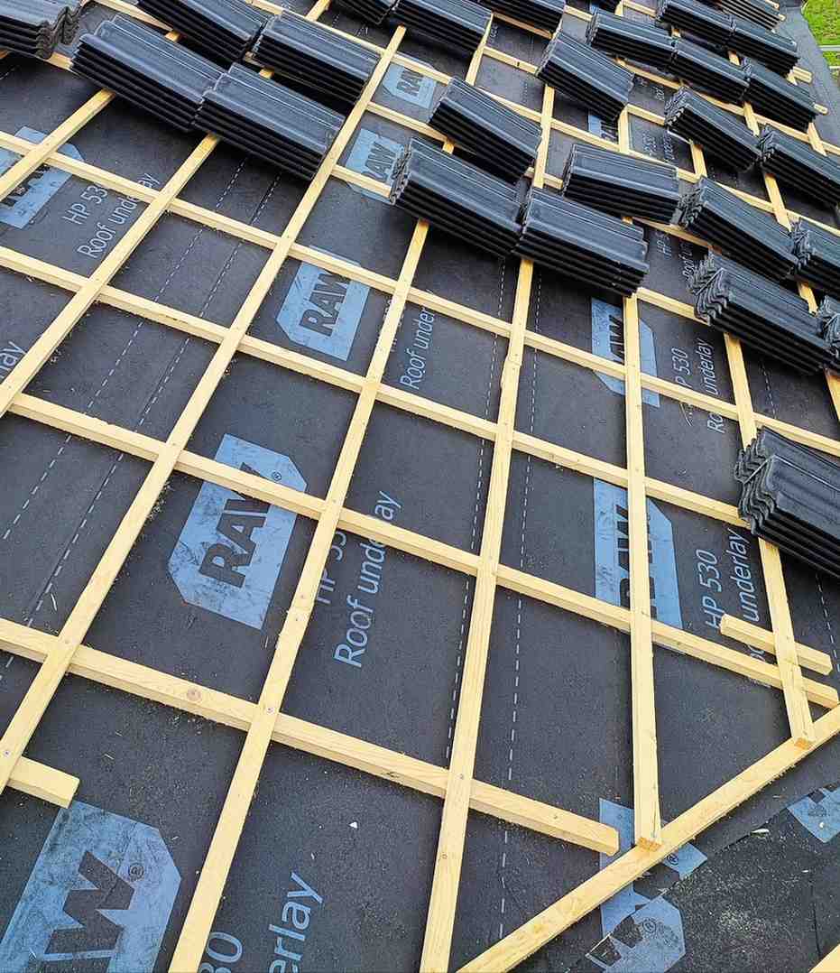 Vi lade ny takpapp som ger ett extra lager skydd mot fukt, och monterade takläkt med precision för att försäkra oss om att de nya pannorna kommer ligga stabilt och säkert. Materialvalet gjordes med fokus på kvalitet och lång livslängd, och varje steg dokumenterades för kundens trygghet.